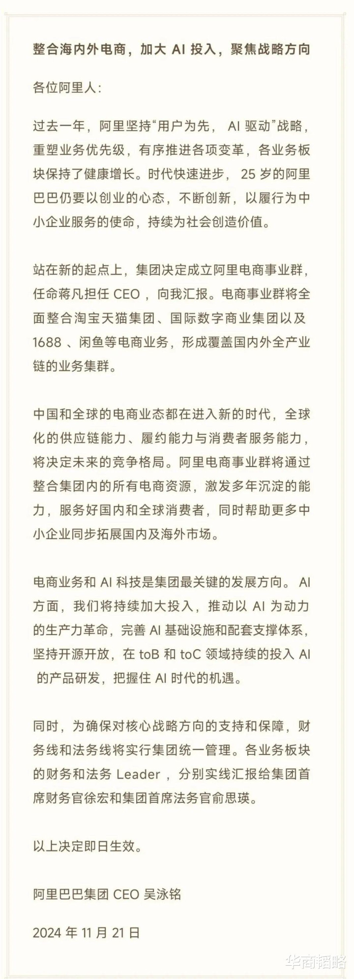 马云、蔡崇信等则给予充分支持。23年12月20日宣布吴泳铭兼任淘天集团CEO当天,蔡崇信发表全员信强调:过去100天,阿里围绕主业进行了坚决的取舍,吴泳铭兼任淘天与阿里云一号位,有助于确保集团对两大战略中心电商和云的统一指挥和高强度投入。
